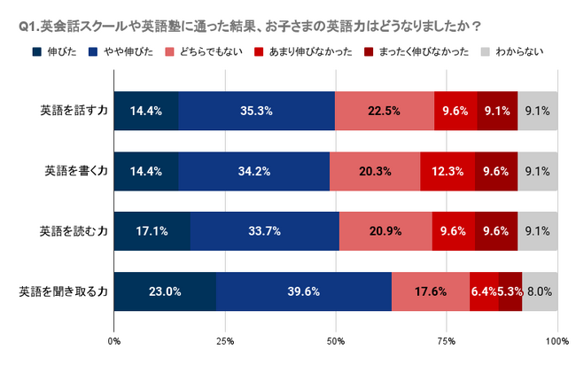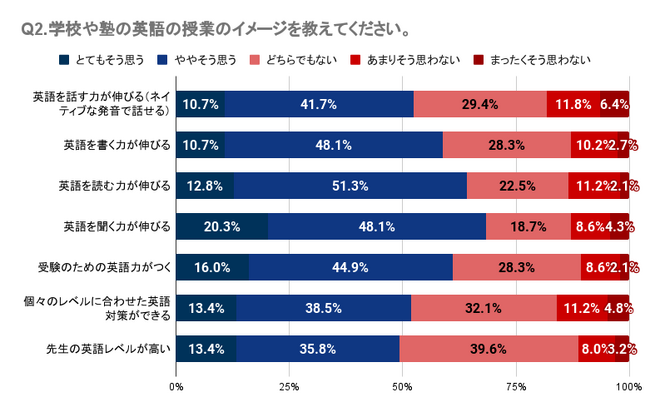 Q1・Q2では、子どもが英会話スクールや英語塾に通っていたが英語力アップの効果を感じていない人が一定数いること、学校や塾の英語の授業に対して明確な効果や良い印象を持てていない人が多いことが明らかになりました。