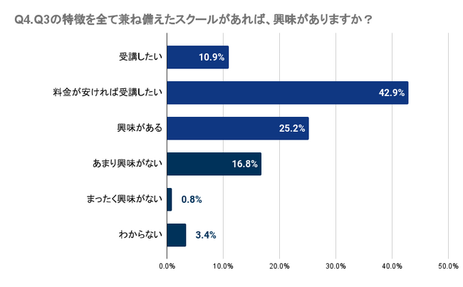 Q4で「Q3の特徴を全て兼ね備えたスクールがあれば、興味がありますか?」と質問したところ、宮城県では10.9%が受講を希望し、42.9%は料金が手頃であれば受講したいと考えています。さらに、25.2%は興味を示していると回答しました。多くの人がこのような特徴を持つスクールに一定の興味を示していることが分かります。