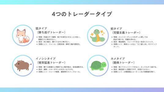 「狐タイプ」「蛇タイプ」「イノシシタイプ」「カメタイプ」の4分類から、自身のトレード傾向を把握