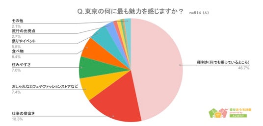 最後に、「東京の魅力」について聞いたところ、「便利さ」が240人(46.7%)で1位という結果になりました。交通の利便性はもちろん、少し歩けばなんでも揃う手軽さに魅力を感じている人が多いとわかります。また、2位は「仕事の豊富さ」で94人(18.3%)、3位は「おしゃれなカフェやファッション」で38人(7.4%)となっており、キャリアアップをしたい人や流行を楽しみたい人が多いことがわかりました。