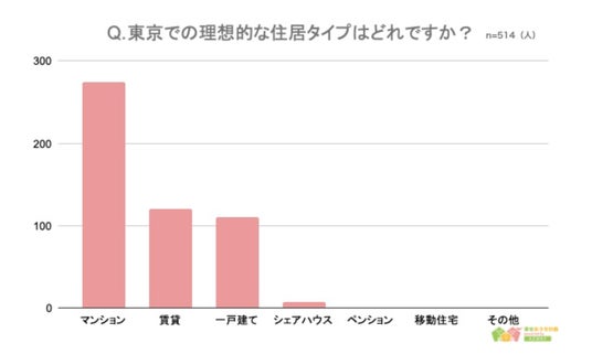 一方、「ひとりで住むのは少し寂しい(30代その他)」や「外国の人たちと一緒に暮らしてみたい(10代女性)」などの理由からシェアハウスを選ぶ人も。他にも人数は1名と少ないものの「ペンション」や「移動住宅」を選ぶ人もおり、東京に出てくるからこそ好きに生活したいという気持ちが伝わってきます。