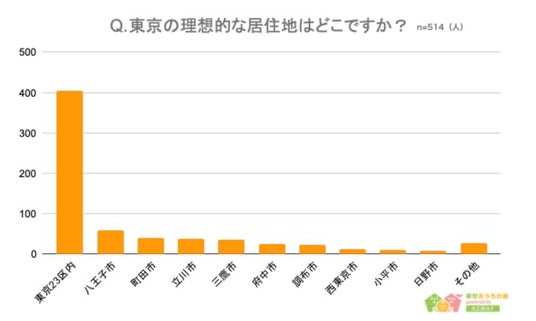 続いて、「東京に住む際の理想的な居住地」について聞いたところ、「東京23区内」が405人で1位という結果に。山手線や中央線など、メジャーな路線が通っている利便性の高さに人気が集まっています。