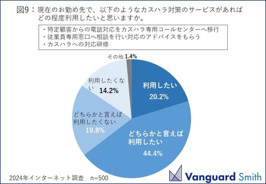 勤め先の対応体制がカスハラの解決につながっているかと聞くと【はい】が36.5%にとどまり、【いいえ】【分からない】の合計が63.5%になりました(図8)。カスハラ対策サービスがあればどの程度利用したいかという問いには【利用したい】(20.2%)【どちらかと言えば利用したい】(44.4%)の合計が6割を超える(64.6%)結果になりました(図9)。
