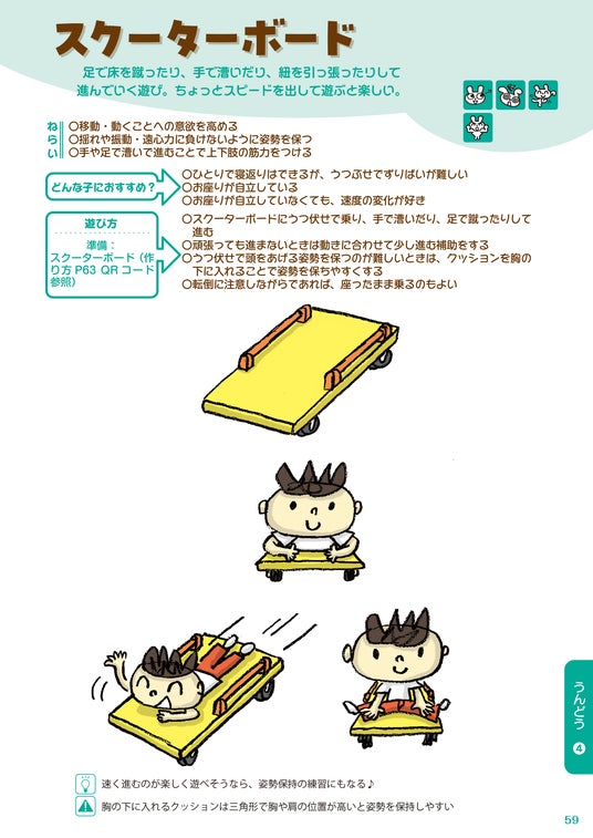 それらの課題を解決するため、重症心身障がい児を専門的に支援する保育士・理学療法士・作業療法士・言語聴覚士が感覚✚αをテーマに遊びのプログラムを作成し、58種類の遊びについて【遊びのねらい】【遊びの対象となるお子様の特徴】【遊び方、工夫の考え方】【刺激される感覚】を掲載しました。