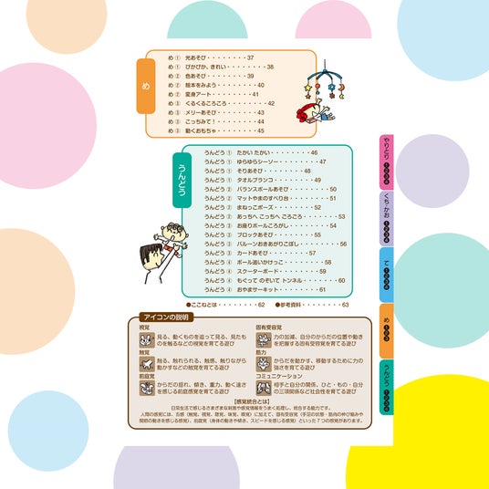 各あそびに【感覚アイコン】を表記し、遊びを経験することでどのような感覚刺激を受けることができるか一目でわかります。