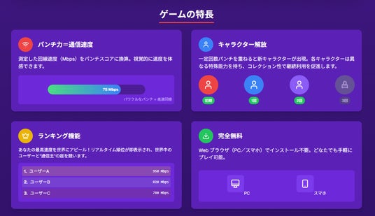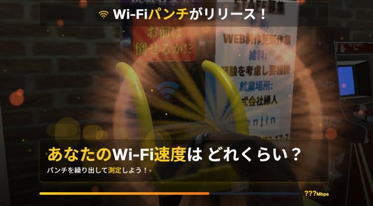 「Wi-Fiパンチ」は、プレイヤーが“パンチングマシーン”を殴ると同時に端末の Wi-Fi 回線速度を測定し、その数値を“パンチ力”としてスコア化するユニークなゲームです。強いパンチ(高速回線)でランキング上位を狙えるほか、プレイ回数に応じて新キャラクターが解放されるコレクション要素も搭載しています。