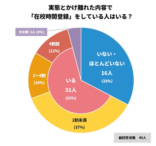一方で「実態とかけ離れた登録をしている教員はいない・ほとんどいない」と答えた回答者は33%と、適切な在校時間管理ができている学校は3校に1校程度にとどまりました。