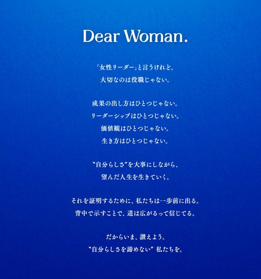『Dear Woman.』では、現在活躍している女性たちの中で、自ら新しいリーダーシップの姿を体現している方、そういった女性たちをサポートしている方、新たな考え方を発信している方、次世代をリードされている様々な女性リーダーをご紹介する、女性のためのエンパワーメントプロジェクトです。