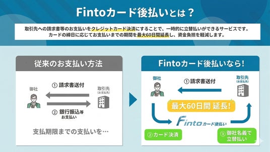 「Fintoカード後払い」は、銀行振込指定の請求書をクレジットカード支払い(請求書カード払い)に切り替えることで、実質的な支払い期限を延長し、企業のキャッシュフローを改善するサービスです。