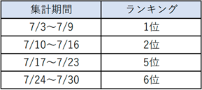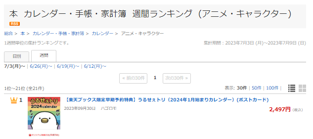 楽天ブックスのカレンダーアニメ・キャラクター部門週間ランキングにて予約開始の翌週に1位を獲得!その後4週連続で同ランキングにベスト10入りしました。 (7/3~7/30集計)