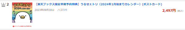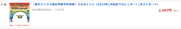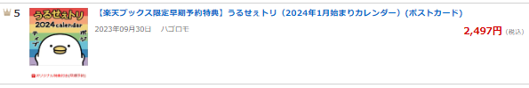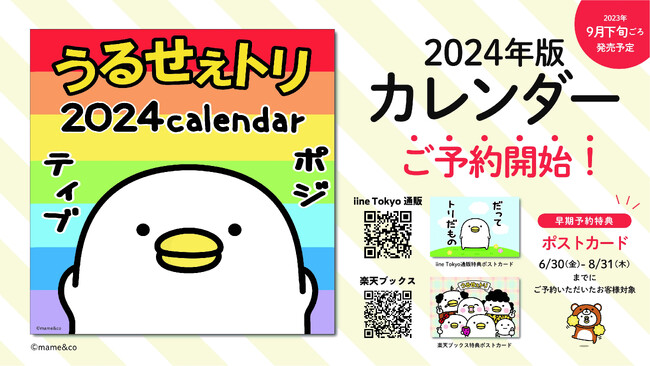 カレンダーの制作・企画・出版を行う株式会社ハゴロモ(本社:東京都千代田区、代表:橘壮太郎)は、「うるせぇトリ2024年版カレンダー」が楽天ブックスのカレンダーアニメ・キャラクター部門 週間ランキングにて1位を獲得し、その後も4週連続で同ランキングベスト10入りしたことをお知らせいたします。(7/3~7/30集計)