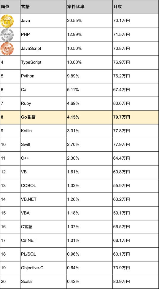 Go言語スキルはクラウドネイティブ開発の核として高い市場価値を維持しています。今回の調査では平均年収957万円で言語別ランキング4位、案件比率4.15%で8位となり、高水準の報酬と堅実な案件数が魅力です。