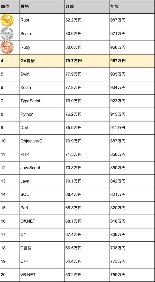 Go言語案件の平均月額単価は79.7万円、平均年収は957万円で、年収ランキングでは4位に位置しています。Go言語はGoogleが開発したオープンソースの静的型付けコンパイル言語で、軽量スレッドであるgoroutineとチャネルによる高性能な並行処理が特徴です。