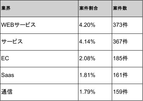 Go言語案件はWEBサービスが4.20%(373件)で最多、サービスが4.14%(367件)と僅差で続き、ECが2.08%(185件)、SaaSが1.81%(161件)、通信が1.79%(159件)となり、上位5業界で約14.0%を占めています。