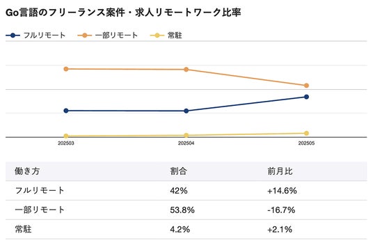 2025年6月時点のGo言語フリーランス案件・求人におけるリモートワーク比率は、フルリモートが42%、一部リモートが53.8%、常駐が4.2%です。フルリモートは前月比+14.6%と大幅に増加しましたが、一部リモートは過半数を維持しつつ-16.7%と減少し、常駐も+2.1%と小幅に増加しています。