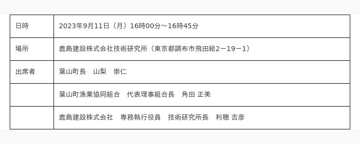 鹿島(社長:天野 裕正)は、葉山町(町長:山梨 崇仁)および葉山町漁業協同組合(代表理事組合長:角田 正美)と、「藻場の保全・再生及び漁業資源増殖のための連携に関する協定」を締結しました。