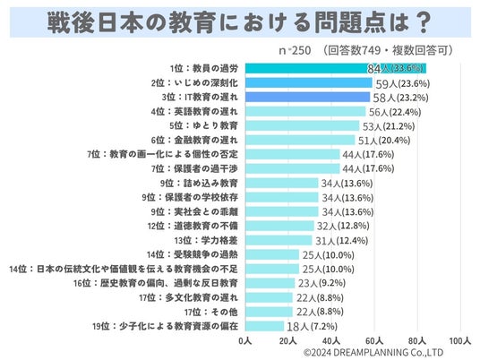 戦後日本の教育問題について聞いてみたところ、最も多い回答が「教員の過労」でした。