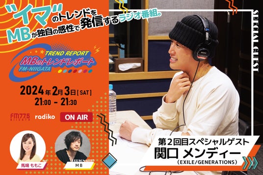 「企業の情報と印象をデザインする」をコンセプトに掲げ、メディアとWEBとオフラインを融合させたマーケティング戦略を提供する、株式会社アナログPR(本社:東京都港区、代表取締役:松浦啓介)は、弊社企画のラジオ新番組「MBのトレンドレポート」(FM-NIIGATA)の第2回目のスペシャルゲストに関口メンディーさん(EXILE/GENERATIONS)をお呼びして2024年2月3日(土)21:00~放送することをお知らせいたします。