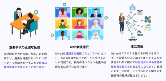 加えて、人事面談や研修での専門用語対応、住居探しなどの生活基盤整備における言語の壁の解消も『Oyraa』がサポート。スマートフォンひとつで世界中の通訳者とつながる『Oyraa』は、調査で明らかになった育成・定着支援の課題を包括的に解決し、真の多文化共生社会の実現に貢献いたします。