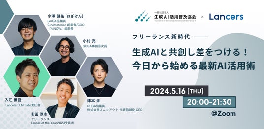 生成AIを安全に活用するためのリテラシーを有するフリーランスの可視化をさらに加速させるにあたり、ランサーズとGUGAによる共催セミナーを開催いたします。前半は生成AIに関する市場動向や未来予測、今後フリーランスに求められるスキルなどについてAI有識者が解説いたします。後半では、生成AI活用を実践しているフリーランスの方をお招きし、学習効率化や生産性向上の具体的な事例とともに、利便性の高いAIツールなどについてご紹介いたします。