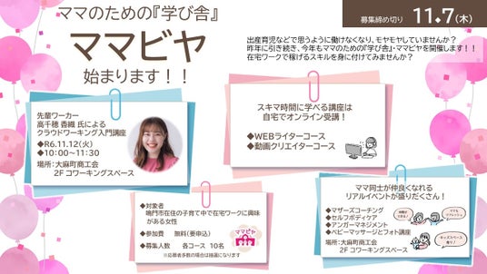 ママのための学び舎事業「ママビヤ」は、隙間時間を活用した在宅ワークによる新しい働き方を応援する取り組みとして、令和5年度にスタートしました。今後は在宅ワーク支援に加えて、子育て中の女性が共に学び、共に稼ぐネットワーク・コミュニティを醸成するような取り組みも同時に行う事業として、継続してまいります。
