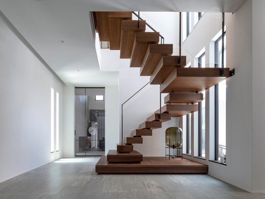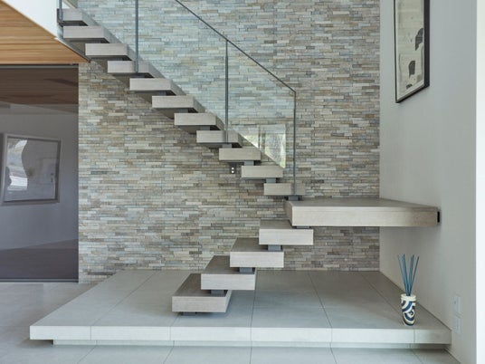背面の天然石と相性のよい色合いとし、階段の力強さと壁面の素材の上品さをバランスよく表現できた作品だと思っています。