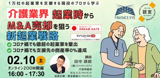 株式会社ファイナンスアイ(本店:大阪府大阪市、代表取締役:田中 琢郎。以下、ファイナンスアイ)は、「介護業界」で独立・起業を志す起業家や既に経営している経営者に向けて【創業時からM&A売却によるエグジットを狙う新起業戦略セミナー】を開催します。事業そのものを一つの商品として売却するために、起業家は創業時からどのような事業計画を立案して、どのようなファイナンスをかけて、事業評価をバリューアップさせてイグジットを実現すればよいのか。1万社の起業家や経営者を支援し、コロナ禍でも介護業界を含めて億超の起業家を輩出し続けたファイナンスアイがリアルに再現してきた内容を伝えます。開催日時は2024年2月10日(土)16:00にウェビナー形式で開催します。2024年の成功に向けて躍進するきっかけにしてもらえればと思います。