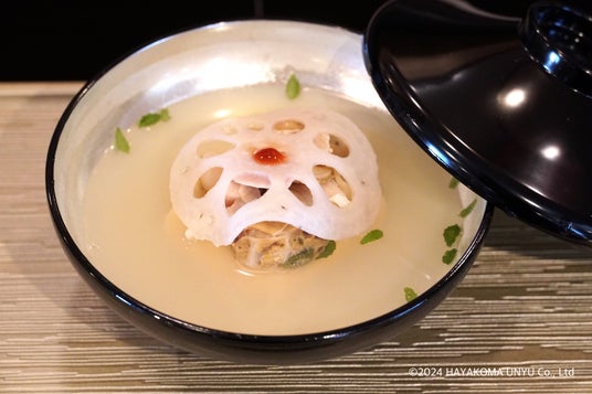 蛤・自家製胡麻豆腐・新蓮根・梅醤boh boh KOBEのスペシャリテである自家製胡麻豆腐に旬の蛤と新蓮根を重ね、梅醤が薫る逸品