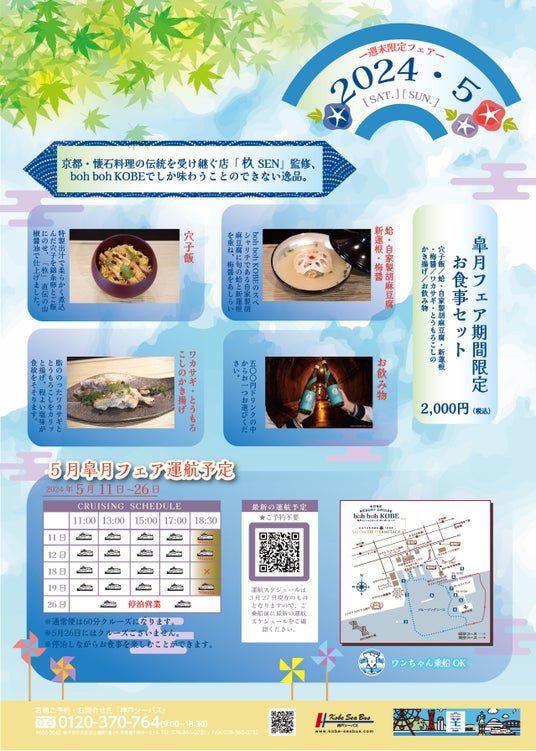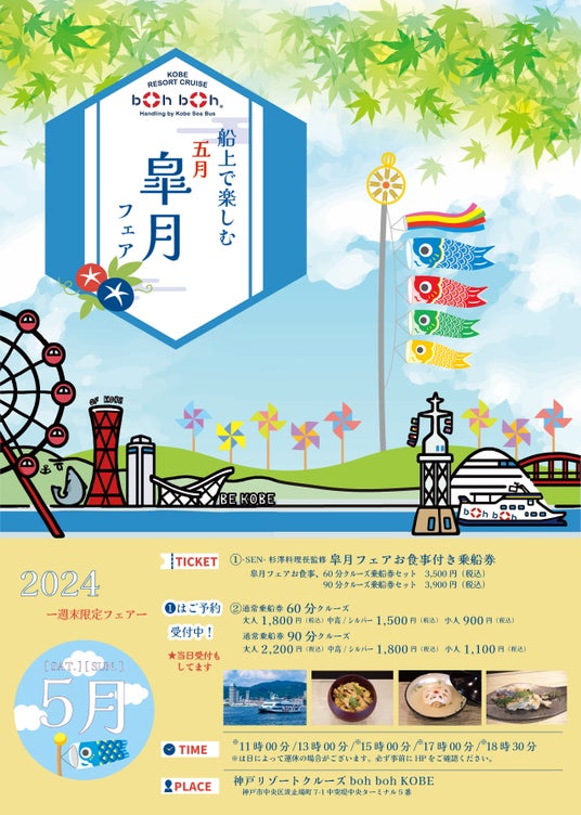 暖かい陽ざしト美しい新緑がまぶしい季節到来。5月の週末限定で神戸シーバスboh boh KOBEでしか味わえない「神戸食」をお愉しみいただける「皐月フェア boh boh KOBE号」を開催!