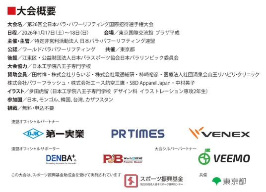 特定非営利活動法人日本パラ・パワーリフティング連盟(JPPF)は、2026年1月17日・18日に開催した「第26回全日本パラ・パワーリフティング国際招待選手権大会」において、複数の企業様と連携した新たな取り組みを実施いたしました。 本大会では、通年で連盟を支える「連盟協賛」企業との連携深化に加え、当連盟最高峰の「全日本選手権」としては創立以来初となる「大会単体への協賛(大会協賛)」企業も誕生しました。 各社がそれぞれの企業課題(組織活性化、理念浸透、マーケティング、CSR)を解決する「共創の場」としてパラスポーツを活用した、最新の連携事例をご報告します。