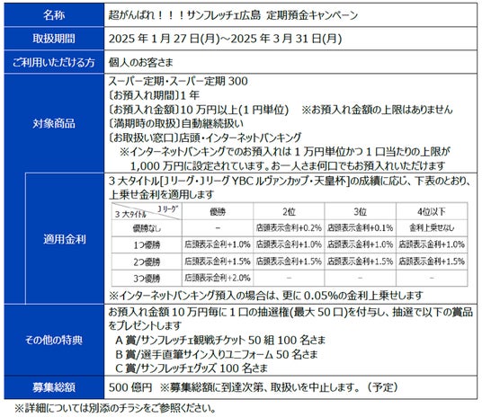 おいても、サンフレッチェ広島の活躍の後押しと地域の活性化へ貢献するため、定期預金キャンペーンを実施しますので、下記のとおりお知らせいたします。