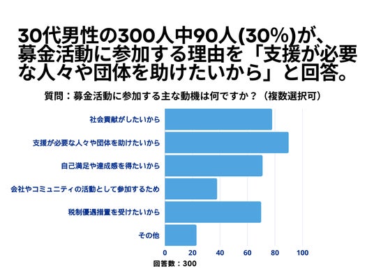 30代男性の300人を対象とした「募金活動に参加する主な動機は何ですか?」というアンケートで90人(30%)が「支援が必要な人々や団体を助けたいから」という結果になりました。