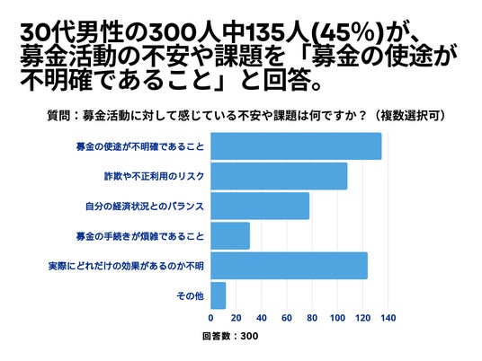 30代男性の300人を対象とした「募金活動に対して感じている不安や課題は何ですか?」というアンケートで135人(45%)が「募金の使途が不明確であること」という結果になりました。