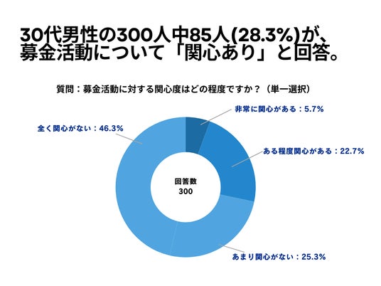 30代男性の300人を対象とした「募金活動に対する関心度はどの程度ですか?」というアンケートで85人(28.3%)が「募金活動について関心あり」という結果になりました。