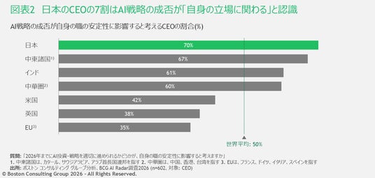 調査では、CEOの72%が「AIに関する主要な意思決定者は自分自身である」と回答しました。特に日本では、その割合が88%に達しています。また、調査に回答した日本のCEOのうち、70%がAI戦略の成否が自身の評価や立場に関わると考えていることが分かりました。他の市場と比較して、この割合は最多です(図表2)。