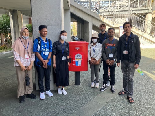 自分たちでポストに取り付けた避難ステッカーの前で記念撮影をする留学生/ 泉大津駅前 / 2023.9.1