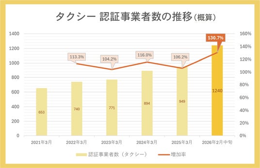 こうした状況を背景に、2025年4月から2026年2月16日時点の統計において、タクシー事業者の認証取得数が前年度比130.7%となり過去最多を更新しました。これまでの最多は2023年4月~2024年3月の前年度比116.0%でしたが、今年度の増加ペースはそれを大きく上回っています。