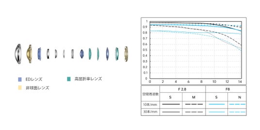 ・レンズ構成:11群13枚 (EDレンズ3枚、非球面レンズ2枚、高屈折率レンズ3枚)