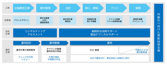 従来の境界防衛型ネットワークからゼロトラストモデルへの刷新を検討している企業の、企画・構想・立案~運用まで全工程をサポートしています。また、常駐支援サービスを提供している別部門とも連携することで、導入だけでなく継続的なアフターサポートや内製化の支援まで幅広く対応しています。