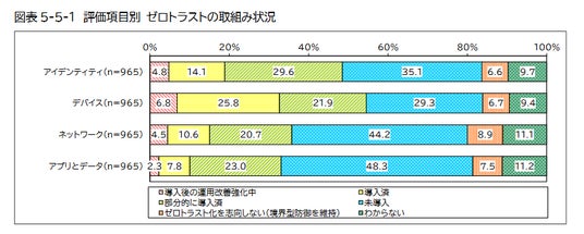 出典: 一般社団法人 日本情報システム・ユーザー協会『企業IT動向調査報告書 2024』 P131(図表5-5-1 評価項目別 ゼロトラストの取組み状況 )https://juas.or.jp/cms/media/2025/01/JUAS_IT2024.pdf