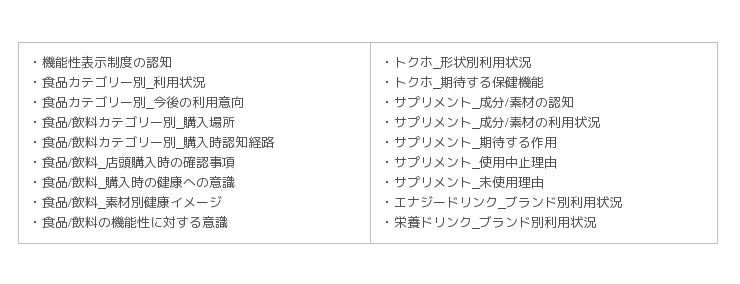 当調査では、各食品別の利用状況や、生活習慣、健康意識などのライフスタイル別に分析をしております。