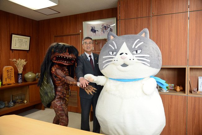 スタートを前に兵庫県民に広く知ってもらおうと、神戸新聞社がデブ猫キャラバンを結成。第1弾として、河童妖怪のガジロウでまちづくりを進める福崎町を訪問しました。マルは、尾崎吉晴町長とオリジナルの名刺を手渡したり、ガジロウとツーショット撮影したり交流を深めました。