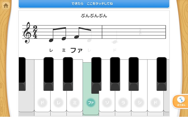 これまであった「ひいてみよう」ではドレミファソラシドを自由に弾いて「音楽を楽しむ」ものでした。今回は少しレベルアップし、曲を弾いて遊びながら小学校以降の音楽の学習に繋がるように工夫したものになっています。慣れないうちは光る鍵盤を順に押して楽しんでいただき、慣れて余裕がでてきたら、楽譜にある音名を読みながら歌っていただければと思います。楽譜に触れる機会が増え、小学校入学後に楽譜を読むことに抵抗がなくなると思います。