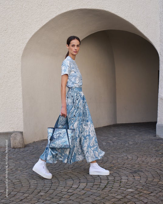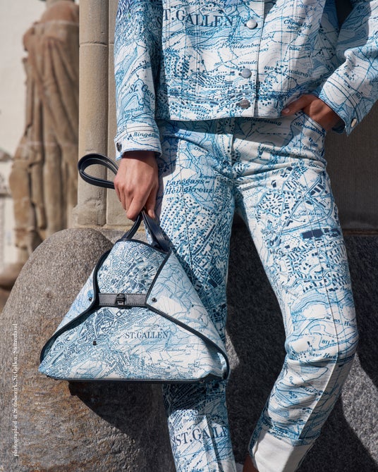 アクリスが誕生し、そして今でも本社を構えるスイス北東部の街、ザンクト・ガレン。中世の時代からファブリックやエンブロイダリーの産地として名を馳せてきました。そのザンクト・ガレンの古い地図をフォトプリントで表現したのが「ザンクト・ガレン マップ プリント」です。2021年秋冬コレクションで発表以来、エレガントでありながら斬新なプリントを使ったレディ トゥ ウェアやハンドバッグ「Ai(アイ)」、スカーフは日本でも人気を博しました。今ではアクリスを象徴するシグネチャープリントとなっています。