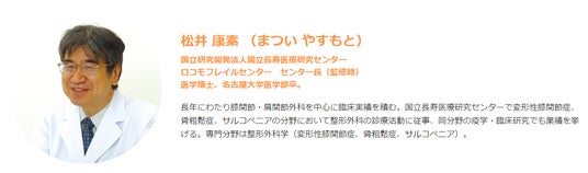 当サービスは変形性膝関節症をはじめロコモ・フレイル予防に長年取り組んできた国立長寿医療研究センターの松井康素(まついやすもと)医師が監修しています。日本整形外科学会の診療ガイドラインで推奨される筋力強化訓練および関節可動域訓練等をひとりひとりの膝の状況にあわせた効果的かつ安全で安心のトレーニングをご提供します。