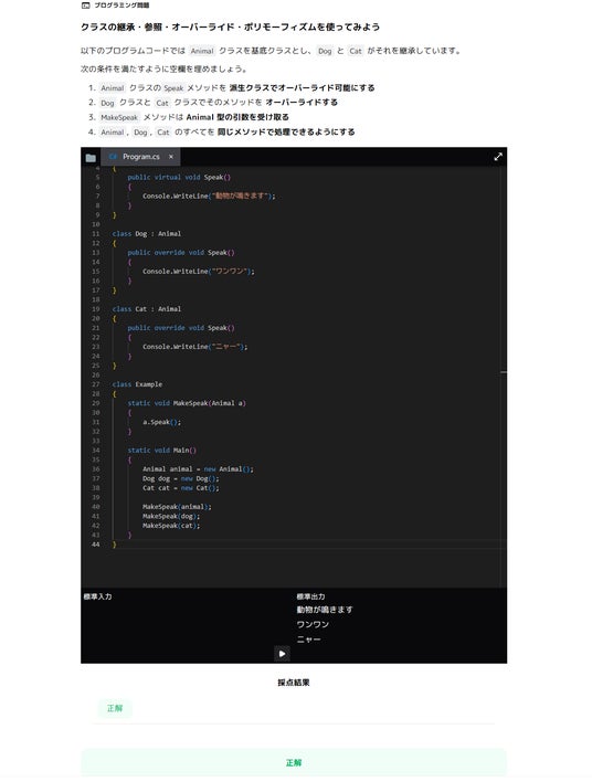 本コースが特に優れているのは、学習者が実際に手を動かし、ブラウザ上で直接プログラムコードを作成して動作を試すことができる点です。単に知識をインプットするだけでなく、豊富に用意された演習問題を通じてすぐにアウトプットできる実践的な環境が整っているため、プログラムの深い理解の促進と、確実なスキルの定着が大いに期待できます。