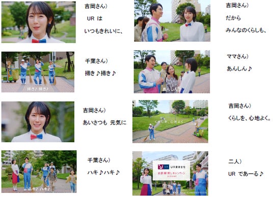 CMの冒頭、吉岡さんがアップで登場し「URはいつもきれいに!」と元気よく声をかけ即座にしゃがむと、カメラは奥にいる千葉さんへズームイン。千葉さんは清掃スタッフの制服に身を包み「掃き掃きダンス」を披露。リズミカルにほうきを使った動きが楽しい演出です。続いて吉岡さんが再び登場し、「あいさつも元気に!」と呼びかけると、学校から帰ってきた小学生たちに、清掃スタッフがハキハキと「お帰り!」と笑顔で挨拶。最後に吉岡さんが「だからみんなのくらしも…」とつぶやくと、通りかかったママさんが「安心♪」と楽しそうに割り込み、吉岡さんと千葉さんが思わず微笑むシーンで締めくくられます。URが敷地内を常に清掃し、住民への元気な挨拶で快適な環境づくりに努めている様子を紹介します。