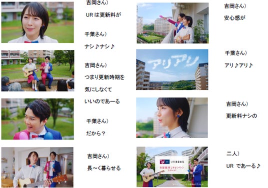 URの敷地内に広がる緑を背景に、ギターを持った吉岡さんが「URは更新料が…」と投げかけると、千葉さんが「ナシ♪ナシ♪」とマラカスを振りながら歌い始めます。リズミカルな掛け合いは「つまり、更新時期を気にしなくていいのであーる♪」と続き、住民たちが楽しそうに耳を傾けます。続く室内のシーンでは「長―く暮らせる安心感が…」と2人がベランダに歩み出ると、空に「アリアリ」と描かれた大きな雲がふんわりと浮かぶラストシーンに。URの更新料ナシのメリットを、明るく軽快な歌に乗せて伝える楽しいCMとなっています。