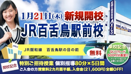 株式会社ワオ・コーポレーションが運営する「個別指導Axis(アクシス)」は、2016年1月21日(木)、大阪府 堺市に「JR百舌鳥駅前校」を開校します。