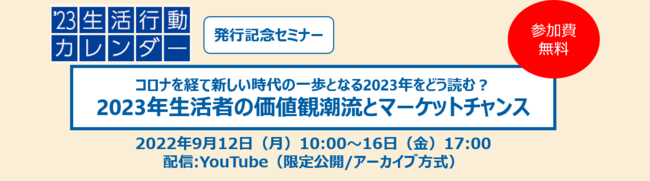 生活者マーケティングをベースに、店舗・売場のマーケティングやプロモーションを提案するトータルエージェンシーの株式会社クレオ(本社:東京都千代田区、代表取締役社長:横井 司)は、 2022年9月12日~16日に「’23年生活行動カレンダー」発行記念セミナーとして『コロナを経て新しい時代の一歩となる2023年をどう読む?2023年生活者の価値観潮流とマーケットチャンス』セミナーを開催します。